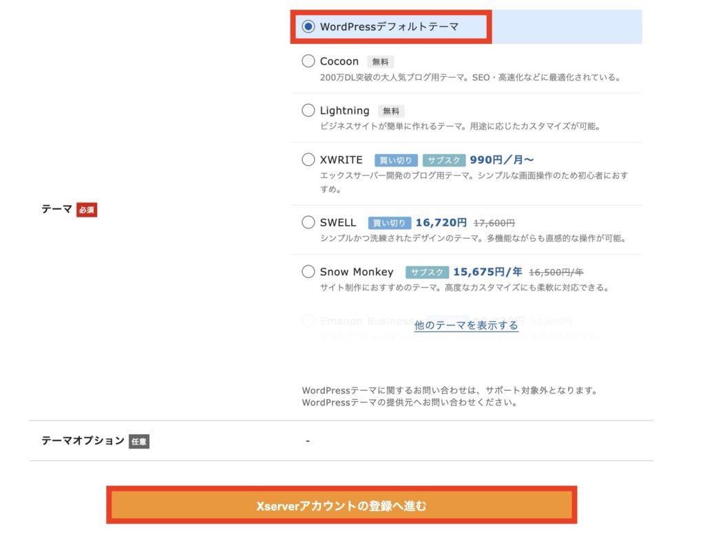 【7】テーマを決定し、「Xserverアカウントの登録へ進む」をクリックします
